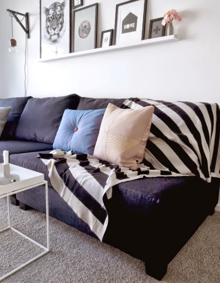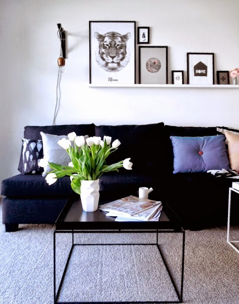 Se trata de darle color con textiles pastel, colores lisos que crean un contraste cálido y una composición de marcos y fotos que además de decorativa es muy fácil de actualizar. Con la fiebre del gris y el blanco, cuesta bastante ver sofás negros, al ver estas fotos pensé que era una forma estupenda de poder inspirarnos a los que como yo tenemos un sofá oscuro en casa.