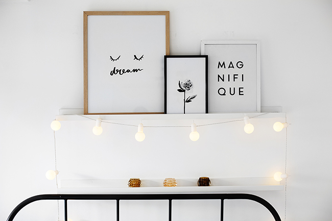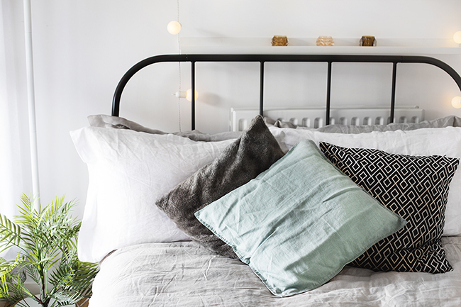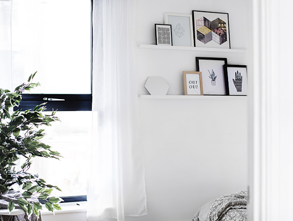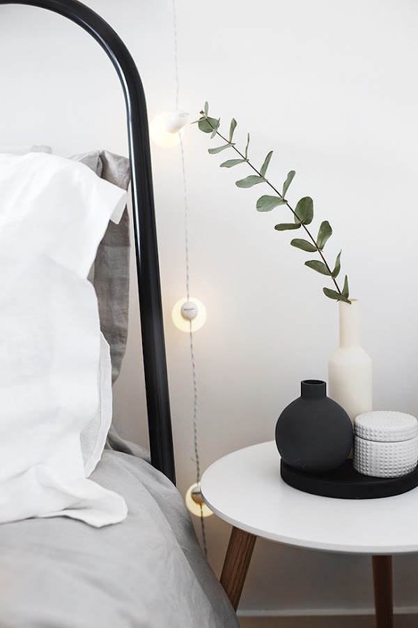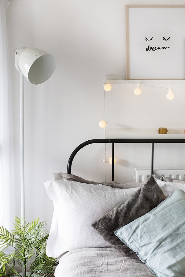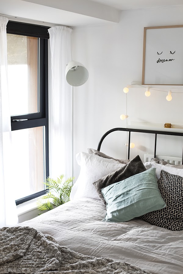 La mayoría del mobiliario así como los textiles son de "San Ikea", el gran protagonista sin ninguna duda es el cabecero de hierro negro, un mueble de gran peso visual que ha sabido integrar a la perfección en un estilo nórdico con mucha clase. Láminas com mensajes, dibujos geométricos, maderas y hasta un tapiz DIY no le falta detalle y el resultado final es como una clase perfecta en la que no podemos parar de coger apuntes.