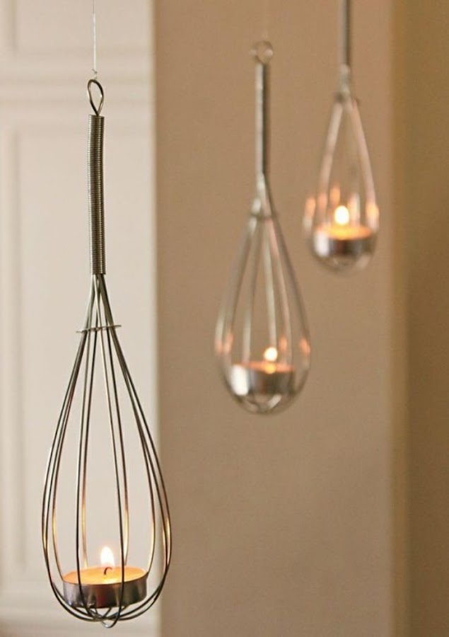Inventar estructuras colgantes en las que colocar velas pequeñas es una gran idea para la mesa principal del salón, o para una rama del árbol del jardín. Las formas de crear velas colgantes son muchas, pero una muy original es utilizar batidores metálicos colgados bocabajo con hilos y conseguir que la vela se quede bien estabilizada en el interior de la cabeza colgante (tiene el tamaño exacto para que quede encajada).