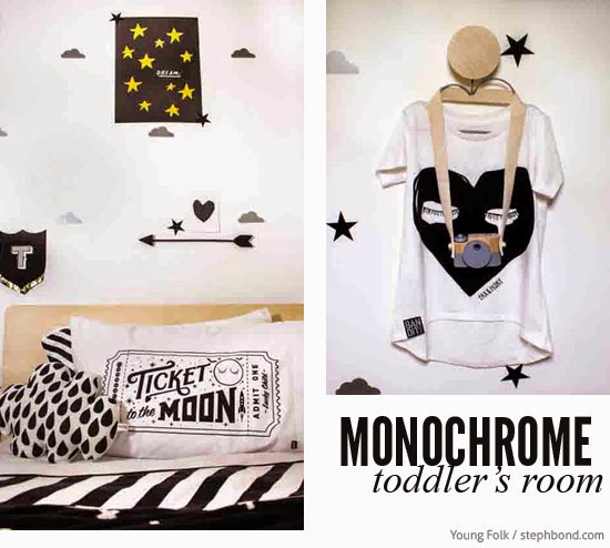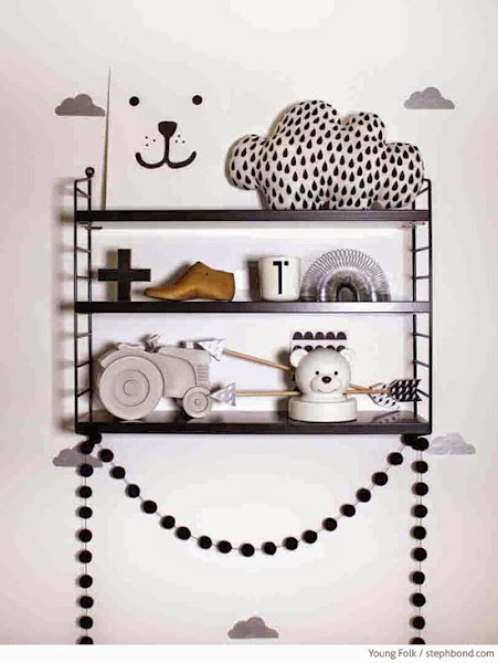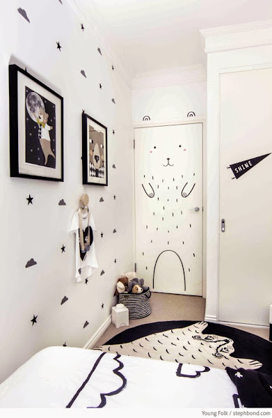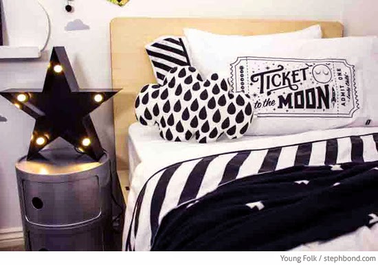 Blanco, negro y gris con pequeños toques de amarillo, la combinación es muy atrevida, quizás demasiado para un niño y nos puede resultar hasta rara pero si nos fijamos bien la idea en general es muy buena, vinilos de formas en la pared, una lámpara de bombillas en forma de estrella y ropa de cama combinada con estampados, si cambiamos el negro por otro color como el amarillo, el verde, el rojo o el azul, conseguimos una habitación para chico en la que los textiles llevan la voz cantante.