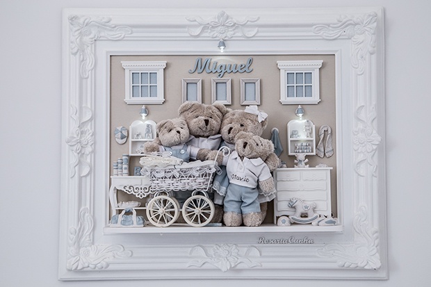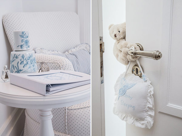 Buscando las características que deseaba se opto por pintar todo en blanco, junto con el mobiliario blanco ya sabrás que se consigue toda la luminosidad posible además de la sensación de limpieza. El tono de color escogido fue el celeste para darle vidilla a la habitación, así que todos los detalles fueron escogido de este color, como los textiles de la cama que mezcla el estampado floral junto con las rallas o el de la cuna con pequeños detalles azules. Y los detalles de cuadros que me parecen super bonitos y originales, me tienen enamoradita. Las claves para conseguir el estilo clásico en la habitación del bebe son las piezas decorativas antiguas como la cómoda reinventada para servir de cambiador, la estructura de la cama, o la lampara de araña, y es que se ha conseguido una habitación de cuento.