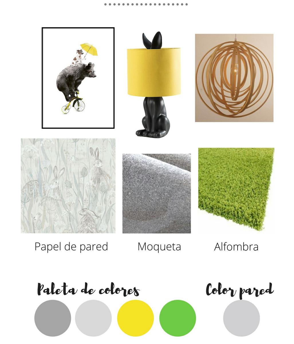 Después de buscar artículos online, y de jugar con diferentes combinaciones de colores, llegamos a este resultado. Como véis, el moodboard no tiene por qué ser complicado, pero debe tener en cuenta vuestros gustos y situación personal. En nuestro caso queríamos una moqueta que no fuera muy clara porque sabíamos que con el bebé podríamos tener “desastres”, y buscamos un papel de pared y una pintura que combinaran bien. El amarillo y el verde como toques de color para crear contraste.