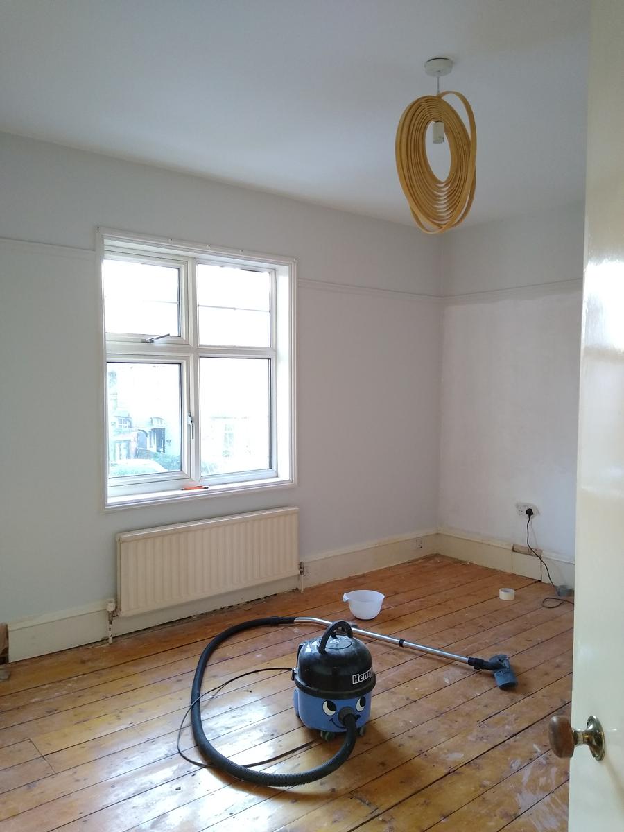 Y una vez con todo planeado, incluso pintura, papel y moqueta comprados, es mucho más fácil llevar el plan a la acción sin sorpresas. En la foto de abajo podéis ver que incluso teníamos la lámpara comprada (en el suelo, aún en la caja)