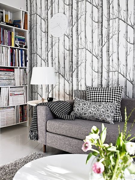 Otra de las opciones que me dejé atrás, fue colocar papel pintado, y esta opción es realmente básica y muy recurrida por la multitud de diseños que se pueden encontrar en el mercado. Por supuesto si eliges esta opción, te cuidado si piensas en colocar algo más, quizás no quede bien y una vez hecho el agujero... nos lo cargamos. Observa el ejemplo de abajo, que a pesar de colocar un papel pintado con motivos de troncos finos en blanco y negro, también han colocado un reloj que a penas se aprecia.