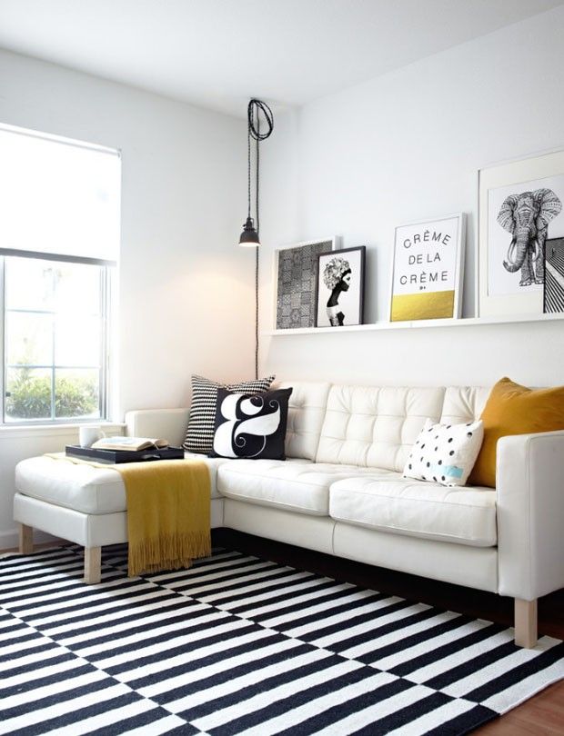 Esta opción de colocar cuadros o láminas enmarcadas a lo largo de una lama de madera a modo de estantería es una opción muy actual que decorará la pared en la que apoya tu sofá. Elige imágenes que contengan los mismos colores que predominan en el resto del espacio y evita que los marcos tomen protagonismo a las imágenes.