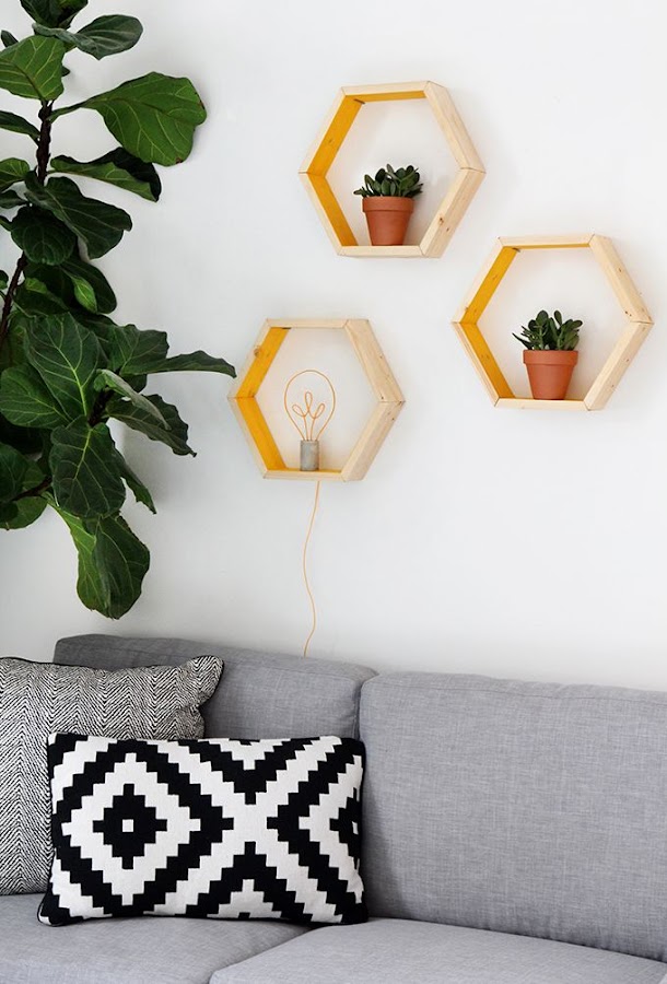 Otra opción podría ser colgar originales estanterías como estas hexagonales. Puedes contener todo tipo de objetos, como plantas, fotografías, luces para ambientar...