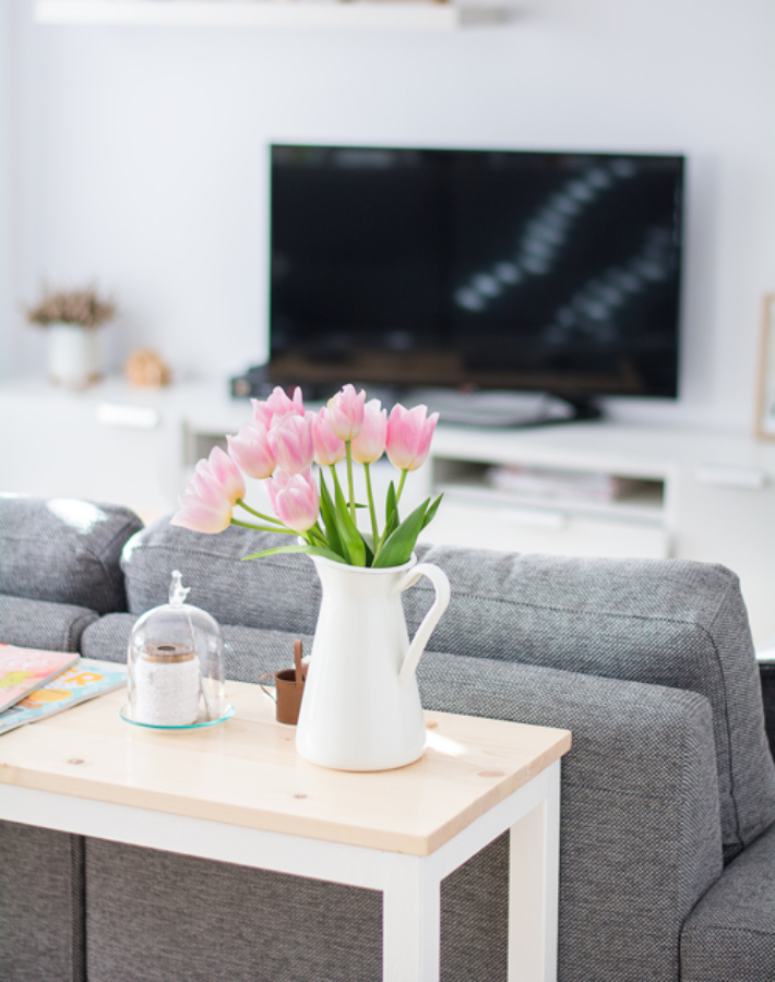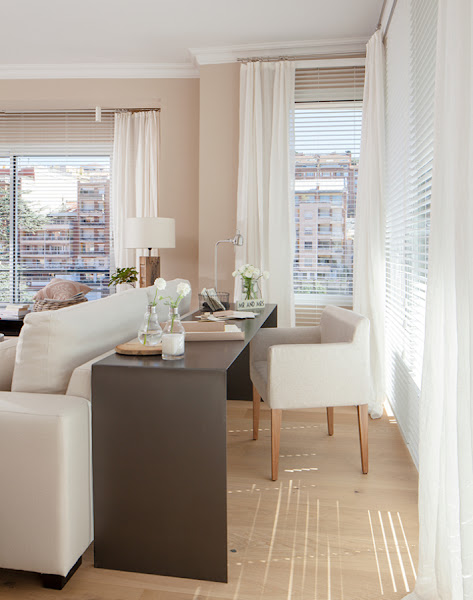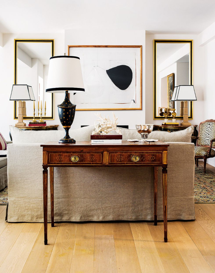 Consola:Una consola de estilo, bien merece el protagonismo absoluto del salón y por ello nos recibe guardándole las espaldas al sofá. Además, sirve como almacenaje extra para las llaves, el mando o inclusos los cargadores de nuestros teléfonos móviles.