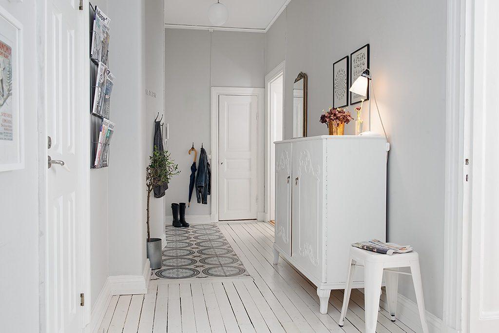 En un recibidor de estilo escandinavo predominará siempre el color blanco, tanto en paredes como en suelo. En contraste, se utilizan muebles y piezas en color negro que pueden romperse con algunos elementos en dorado, o muebles de madera. La nota de color la pondrá una planta o unas flores.