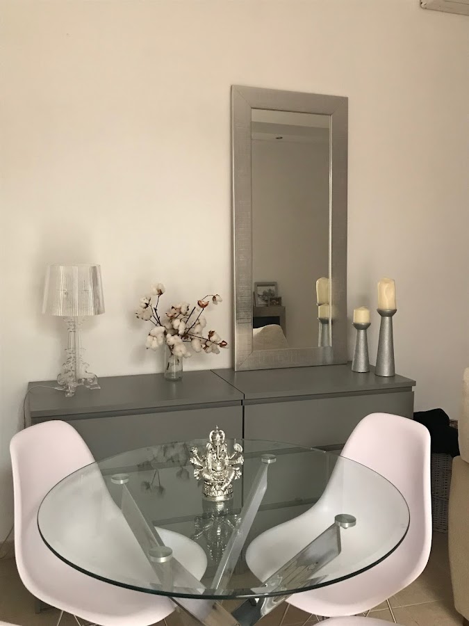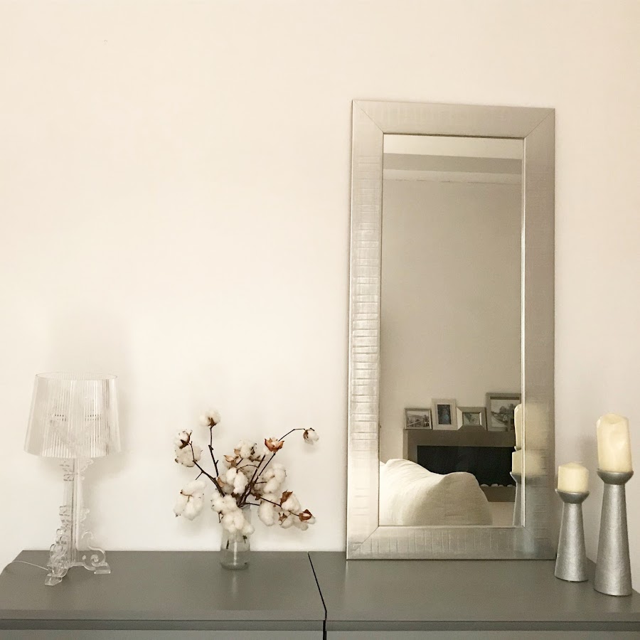 Una de las tendencias que se llevan a la hora de decorar, es dejar el espejo apoyado en la pared sobre el mueble, en este caso es el aparador. Yo lo he colocado en posición horizontal. A un lado he colocado una lámpara gris y al otro extremo coloqué haciendo una pequeña composición de alturas Portavelas, jarrón, y una vela en su vaso. Como ves tienen 3 alturas diferentes que encajan a la perfección.