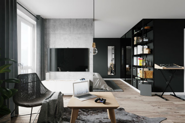 En las paredes veréis pintura blanca (igual que el techo con focos empotrados), también negra remarcando la zona de dormitorio, y finalmente, gris.