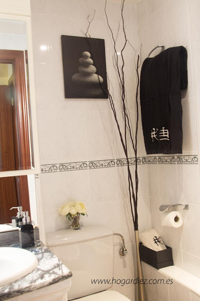 Como puedes ver por las imágenes y aprovechando que la cenefa de las baldosas era color gris, decidimos unificar un poco el color y optamos por el negro y blanco para el resto de los complementos. Así es que compramos una cortina para la bañera en estas tonalidades. Unas toallas a juego y el resto de accesorios del baño del mismo color.