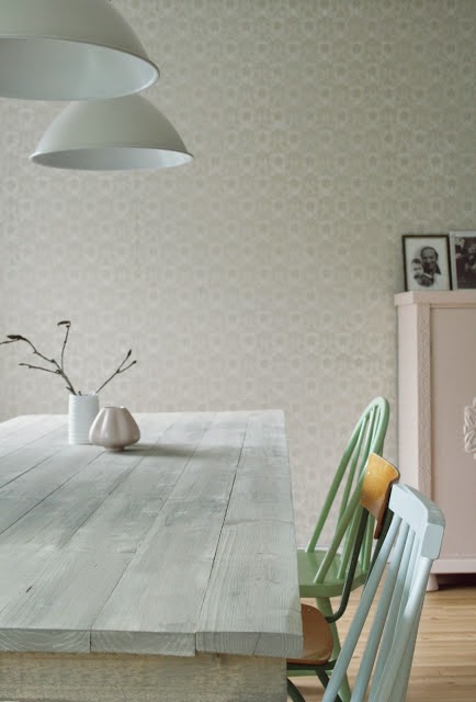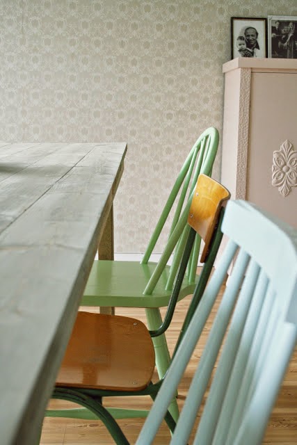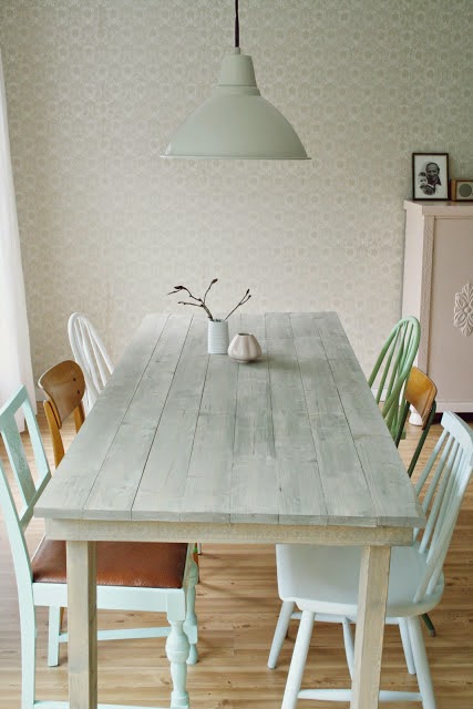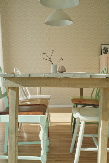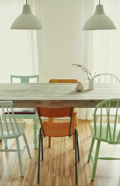 Hoy quería compartir con vosotros estas fotos que encontré navegando, ya sabéis que mi comedor es rosa pastel y estoy encantada con él, pero estas sillas en diferentes tonos de verde y azul pastel me parece una idea muy bonita, además si tenéis sillas para restaurar podéis usar estos tonos para darles una nueva vida el resultado es tan bonito como el comedor protagonista de hoy.