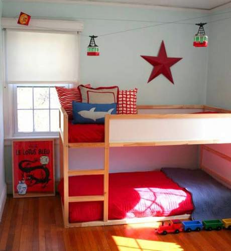 Depende de la longitud de la habitación, y de donde esté colocada la ventana y la puerta, hay varias opciones, para poder optimizar el espacio, en un dormitorio compartido para dos niños.