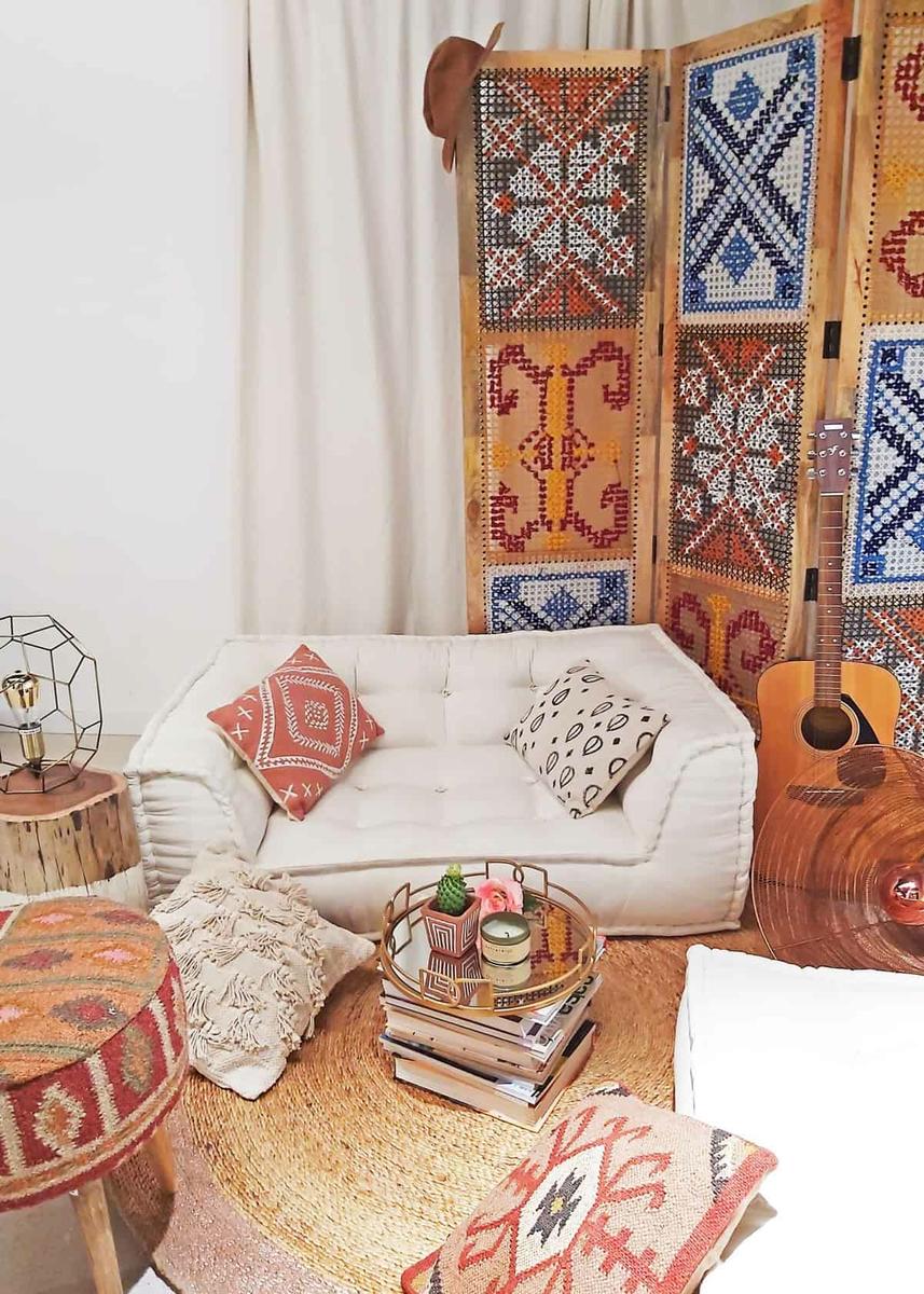Las alfombras de estilo marroquí son una gran elección para una sala de estar con estilo boho. Son piezas hermosas que se combinan con telas coloridas que le darán un aspecto inigualable a tu sala de estar.Un poco de brillante