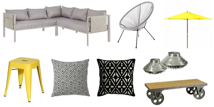 ¿Quieres equipar bien tu terraza? Pues elige un confortable sillón para exterior, como este que puedes encontrar en nuestra tienda. Una mesa de estilo industrial y una silla de diseño serán el centro de esta decoración. Combina textiles con diferentes estampados geométricos. ¡Será un éxito!