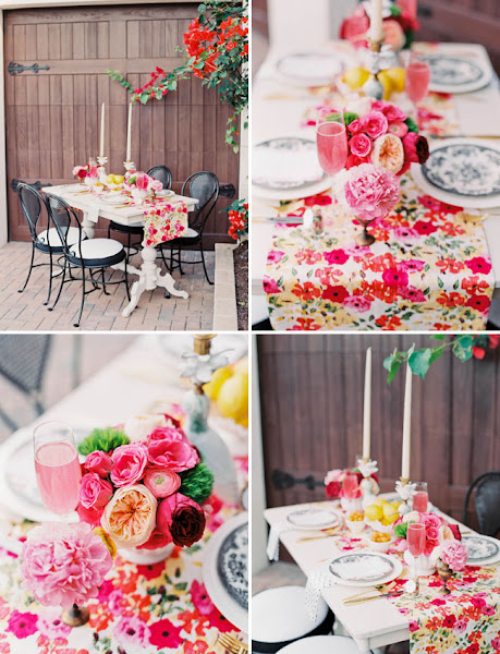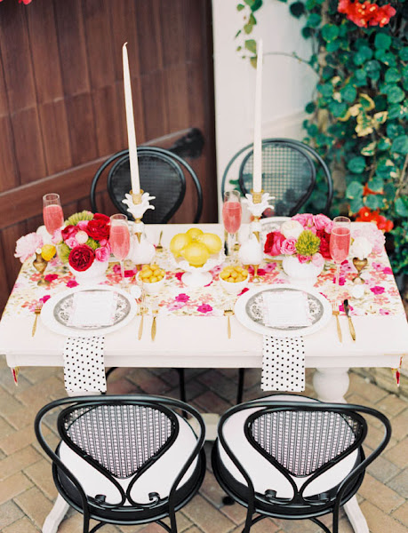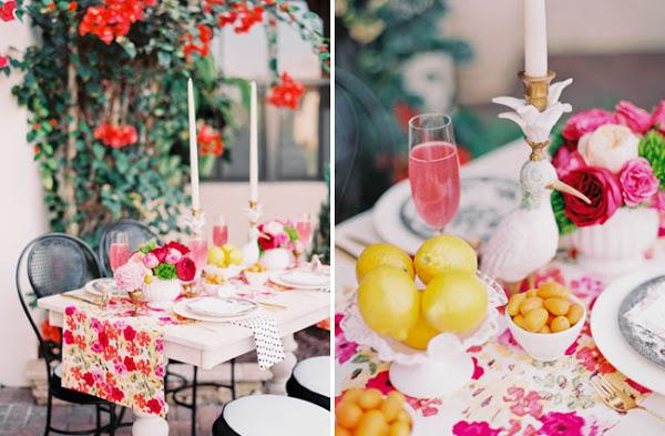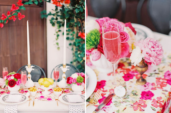 Y para que te inspires hoy te traemos una mesa perfecta para el verano: atrevida con muchos color y con pequeñas dosis de glamour.El color predominante en la mesa es color femenino por excelencia: el rosa, presente en el camino de mesa y en los adornos florares. Las servilletas blancas con lunares negros son el elemento contraste de la mesa. Vajilla vintage, candelabros y cubertería en color oro aportan ese toque glam a la mesa. El centro de mesa compuesto por composiciones de diversas flores (rosas, peonias, clavel) y varios recipientes con cítricos. Para las etiquetas de los nombres de los comensales han utilizado unos pequeños botes de cristal llenos de confeti de colores.