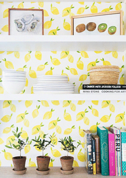 En la cocina: Te atreverías con un papel pintado lleno de vitaminas? Agrega al corazón de tu hogar un poco de fantasía con colores brillantes como este amarillo! Mira que vida le da a esta zona de estantes