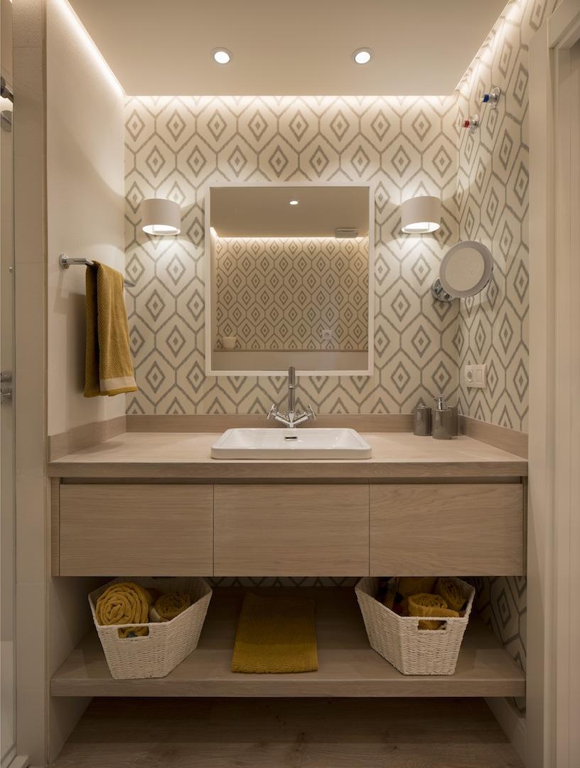 El decorar alguna pared del baño con papel pintado, quizá nos lleva a pensar en unas desventajas parecidas a las de hacerlo en la cocina. Pero ya hemos aclarado que, hoy en día, los papeles pintados ya se fabrican con materiales lavables y también resistentes a la humedad. Esta última característica muy importante a la hora de elegir un papel pintado para el baño. En el caso de esta estancia, normalmente, los tonos neutros y las formas geométricas son las notas predominantes.