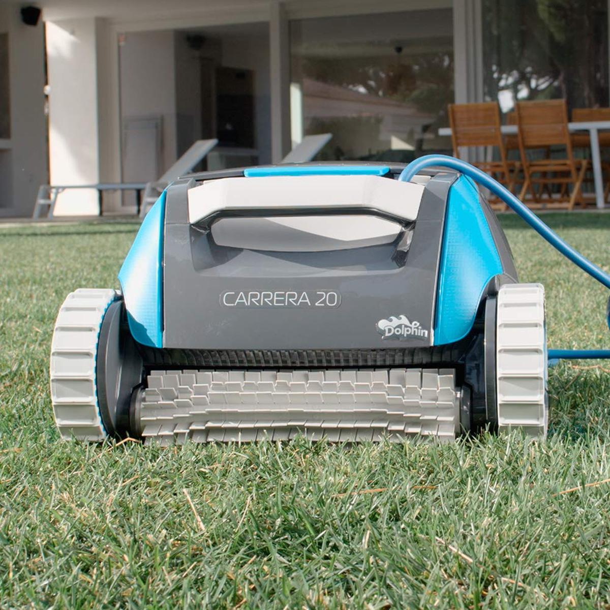 Fuente: amazon Si no quieres reparar en gastos y quieres tener lo último del mercado, tu robot de piscina es el limpiador automático Dolphin Carrera 20.Este robot tiene unos sofisticados algoritmos para facilitar al máximo su uso. Tiene una programación avanzada que se adapta a la forma y el tamaño que le permite el acceso a la totalidad del vaso. Dispone de un de cepillo de alta gama con un patrón de movimientos que garantiza la absorción de la suciedad. La función de programación le permite seleccionar fechas y horarios de limpieza. Energéticamente, es de lo más eficientes del mercado. Está recomendado para piscinas de hasta 15 metros de longitud.Funciona conectado a la red eléctrica con un cable de 15 metros. Su precio oscila entre los 700 € para limpieza de fondo y paredes y 550 € para solo fondos.