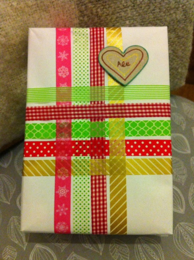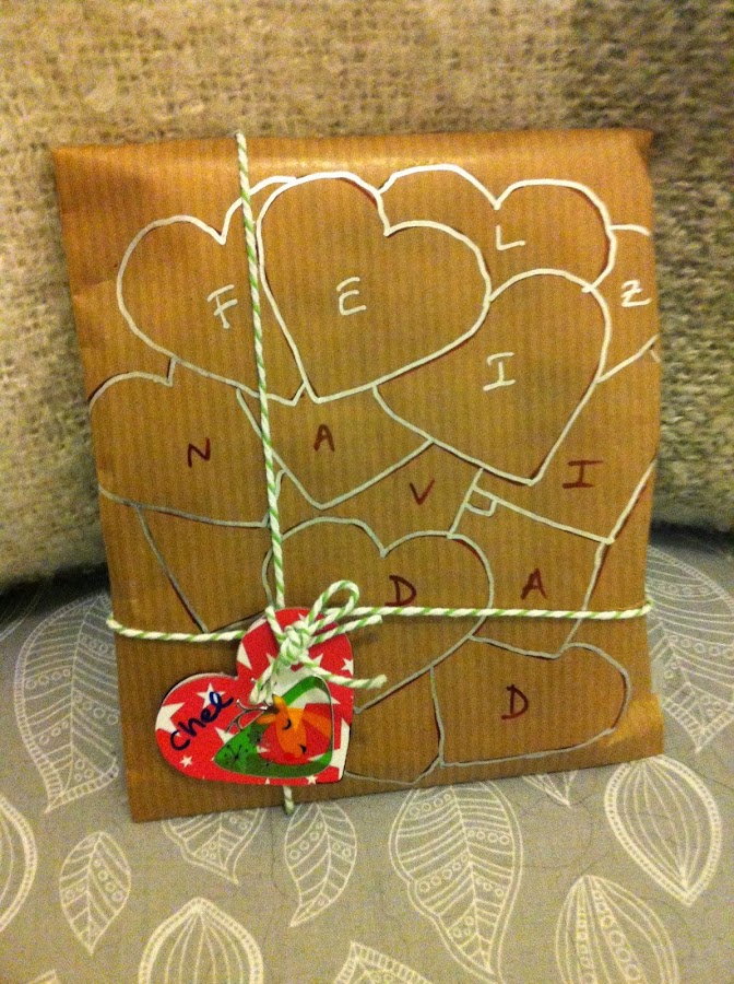 Así quedo el mio (tenia poca tinta de color). Yo imprimí dos folios y los uní con un celo por detrás. Al envolverlo deje esta unión en el lateral para que no se viera.