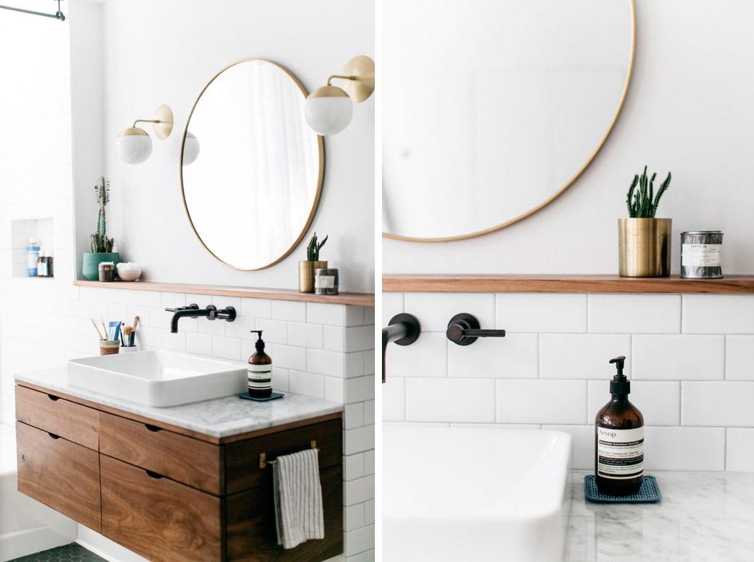 Tan importante como elegir bien el mobiliario es escoger los complementos que le den ese toque diferencial y con alma a tu baño. Detalles como los apliques, toalleros, jabonera, el espejo, los colgadores o recipientes. Por ejemplo en este baño se han escogido estos detalles en tonos dorados: