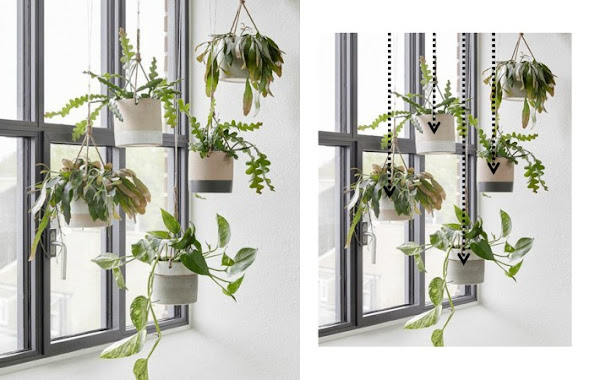COMPOSICIÓN DE PLANTAS COLGANTES A DIFERENTES ALTURAS ¿Os gustan las plantas colgantes? Siempre podéis colocar una sola pero es mucho más bonito estéticamente si colgáis dos o tres a diferentes alturas. O incluso una cortina natural delante de la ventana con macetas y plantas colgantes.