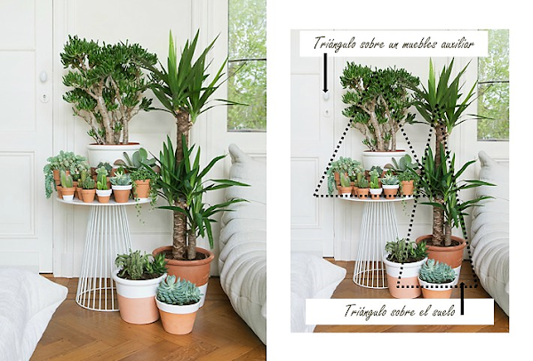 Crear una composición de plantas en forma de triángulo es siempre una apuesta estética segura. Te doy tres ejemplos: