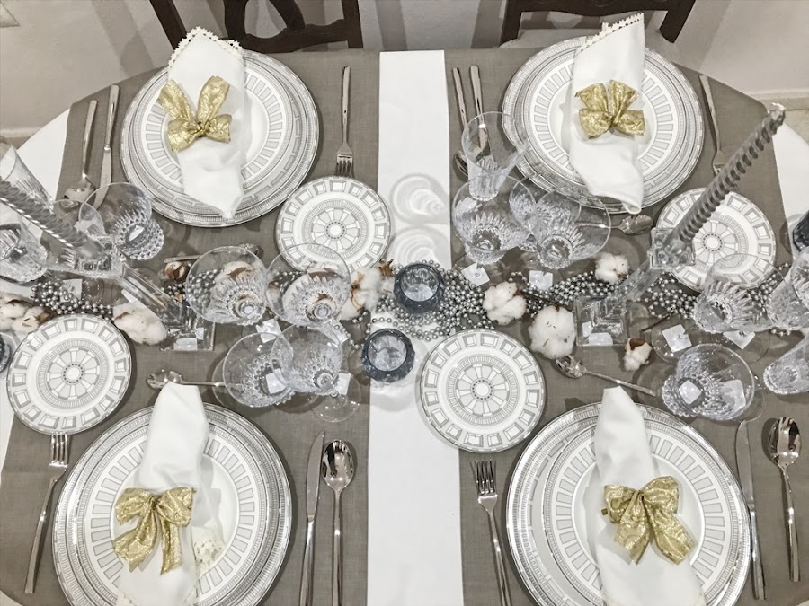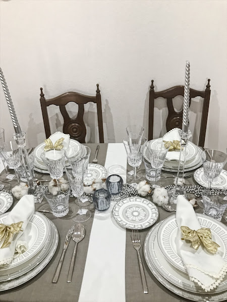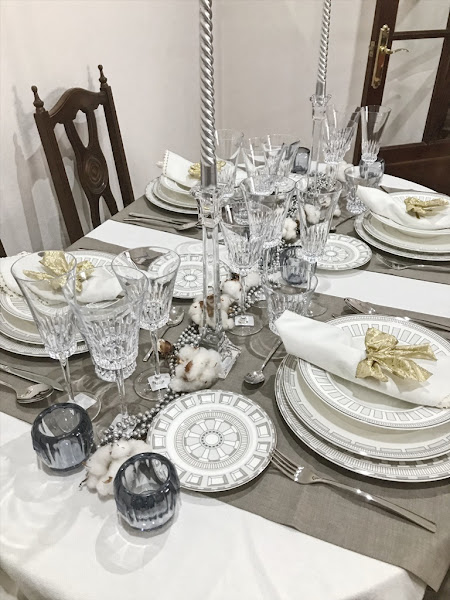 Cuando pienso en decorar una mesa para navidad, tengo claro que no deben faltar las velas. Lo primero utilizar porta velas de cristal, el color del cristal cuando refleja la luz de la velas consigue que el ambiente sea más especial, junto con dos candelabros de cristal, una pieza muy fina. Añadí cadena de bolitas en plata y unos toque naturales, utilizando el algodón seco, es mi planta preferida de este otoño.