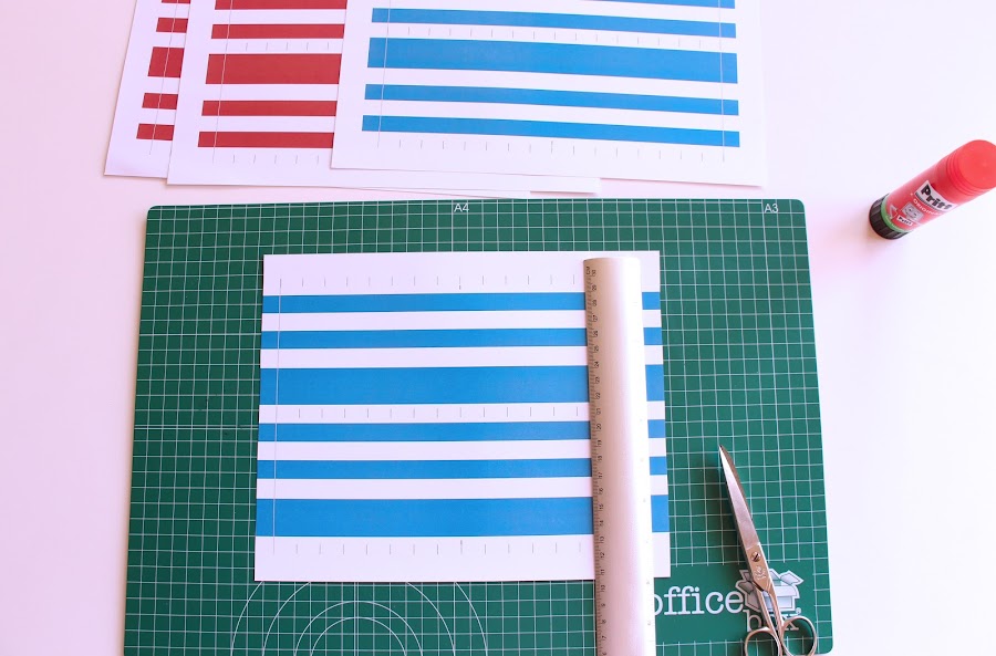 -papel DINA4 (yo he utilizado cartulina impresa con rayas rojas y azules, os lo podéis descargar aquí y aquí)