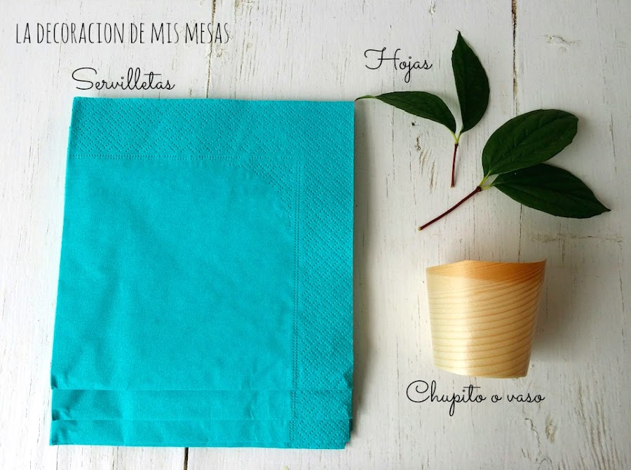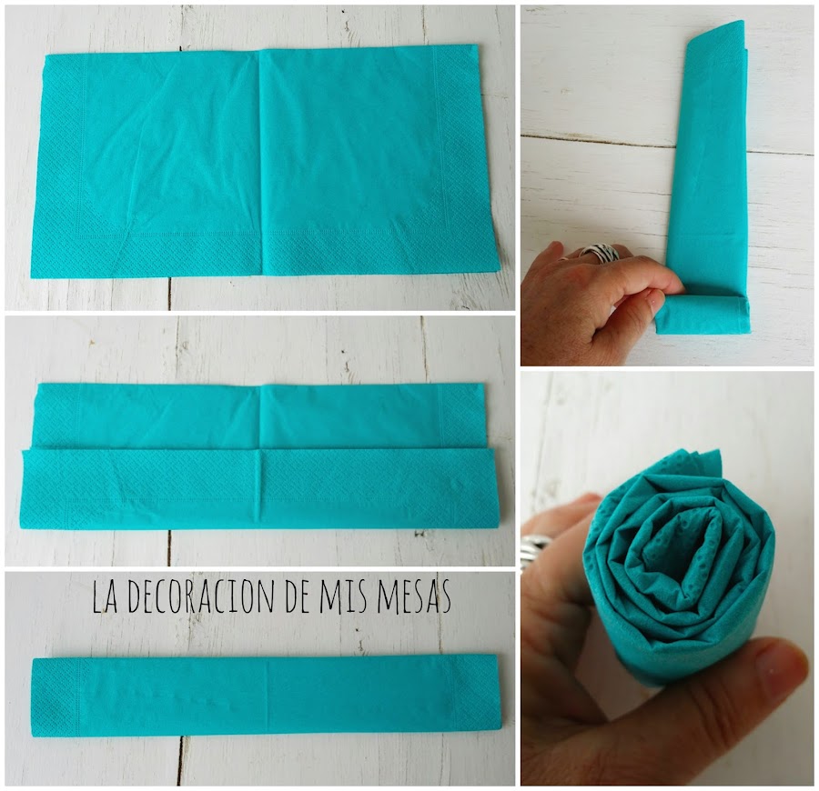 Abrimos la servilletas por la mitad, doblamos a lo largo y volvemos a doblar, nos quedará una tira alargada que enrollamos con cuidado. Introducimos en el cubilete que hayamos elegido y le añadimos unas hojas naturales o de papel.