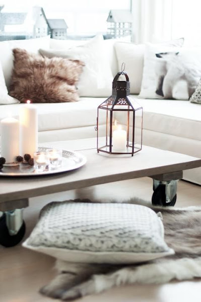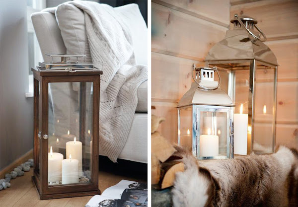 Y luego, otro gran aliado para conseguir una atmósfera calida y acogedora son las velas. ¿Quien no se ha quedado nunca mirando embobado la llama de una vela? Yo mientras escribo esto tengo unas cuantas velas encendidas, que me ayudan a concentrarme. Cualquier llama, por pequeña que sea nos transmite calor, ya sea de forma real o a modo de sensaciones. Me gusta mucho encender velas y apagar el esto de las luces (normalmente se ve bien) y de esta forma crear un ambiente mas acogedor. Lo bueno que tienen las velas es que demás puedes usarlas de muchas formas como tenerlas colocadas en bandejas, usar faroles, candelabros, portavelas, en un plato o sobre una simple madera. En mi casa, suelo usar platos de madera para crear conjuntos mas cerrados con velas de distintas alturas y bandejas de cerámica para hacer composiciones alargadas con velas del mismo tamaño. Aunque los faroles ya sabéis que son también mi perdición.