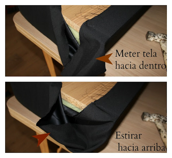 Para el asiento superior, hacemos lo mismo, ponemos la espuma encima de la tela , y la envolvemos como si fuera un regalo.