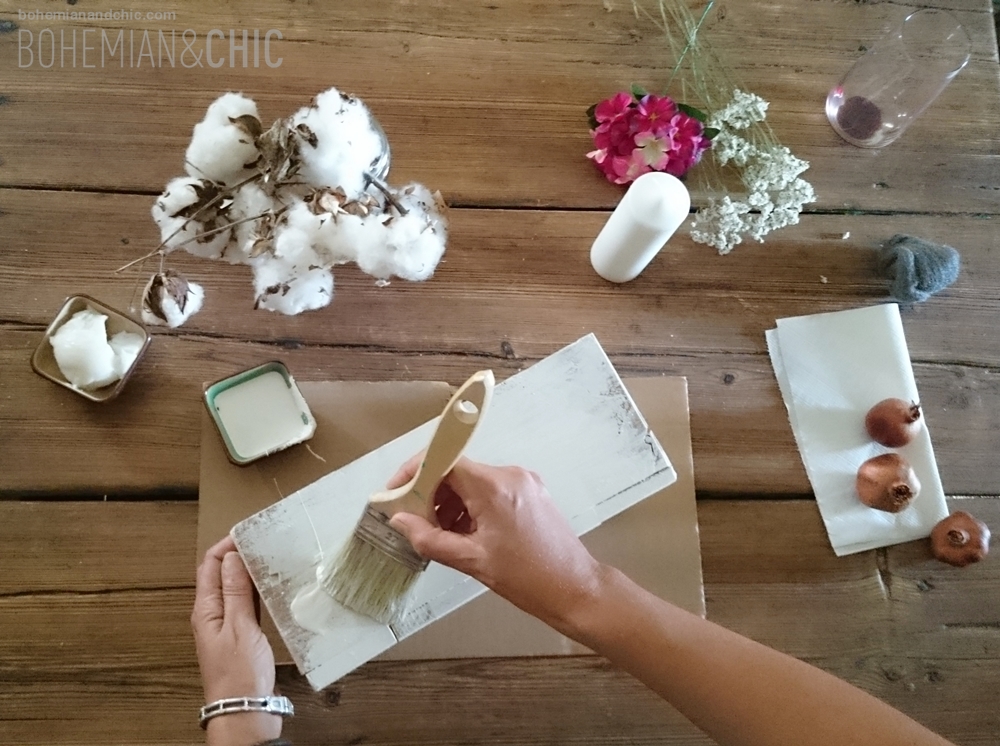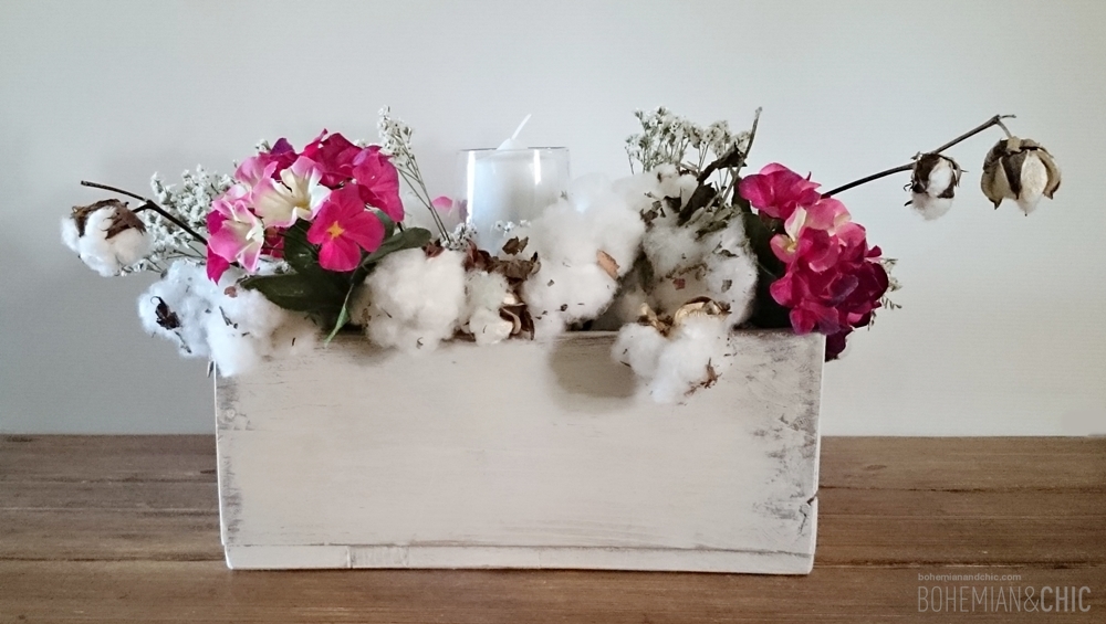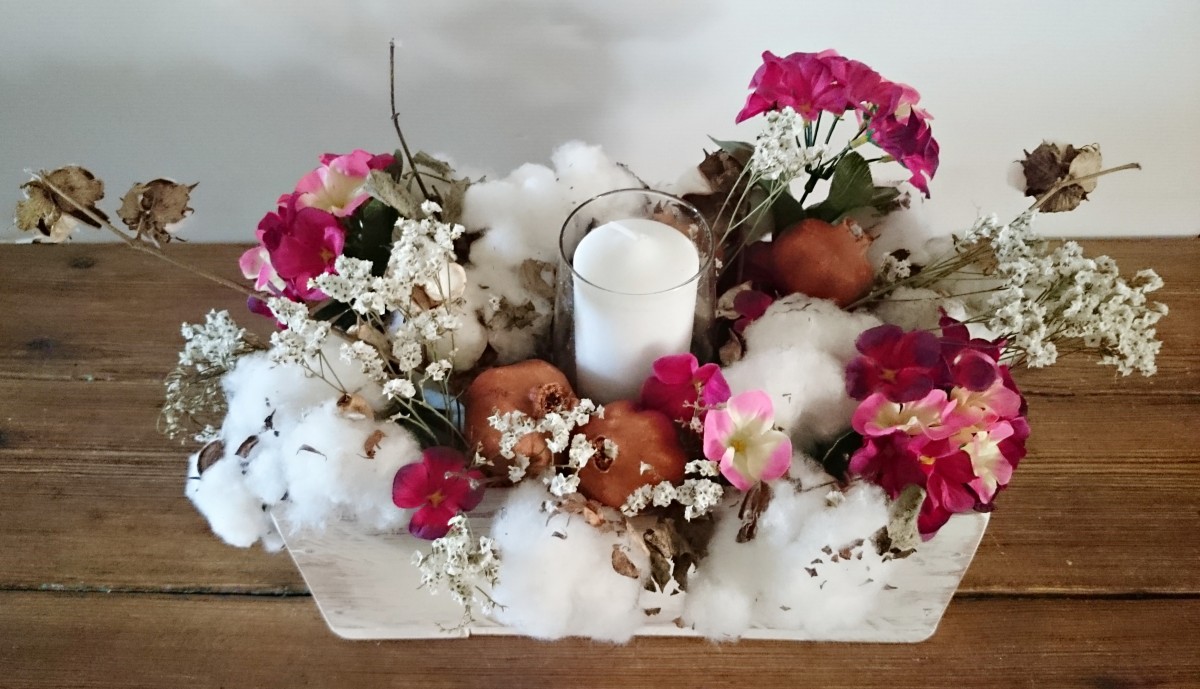 Para ello yo he utilizado materiales que tenía en casa desde flores que había secado en temporadas anteriores como las flores de algodón y paniculata.Para realizar el centro he utilizado como base un cajón de madera reciclada.