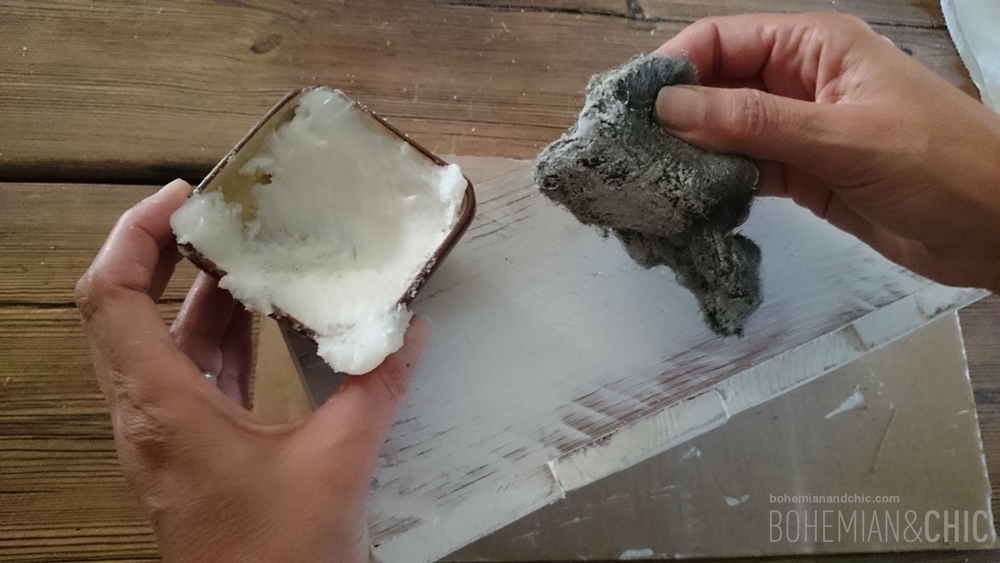 2º Cuando la pintura estuvo seca( unos veinte minutos aproximádamente) impregné la lana de acero en cera natural y lijé el cajón a la vez que le daba el acabado nutriendo la madera, incidiendo en las esquinas para retirar parte de la pintura ,limpié el sobrante de la cera con un poco de papel y así tener un efecto decapado. Cuando secó la cera ( una media hora) saque brillo con el papel de cocina.
