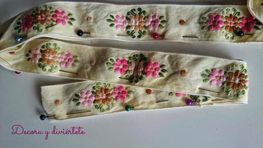 Yo utilicé esta cinta bordada , pero también puede quedar muy bien con una cinta de encaje o si lo queréis hacer un poco infantil solo tenéis que cambiar el estampado y listo .