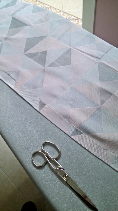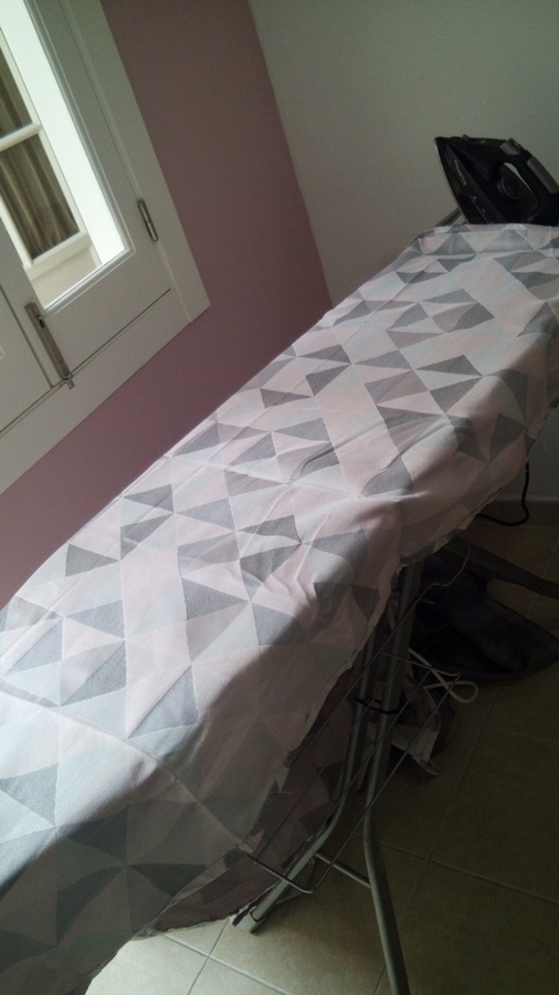Ahora nos vamos a la tabla de la plancha. Coloco la cortina y gracias a sus lineas me sirven para trazar la linea por donde quiero el dobladillo.