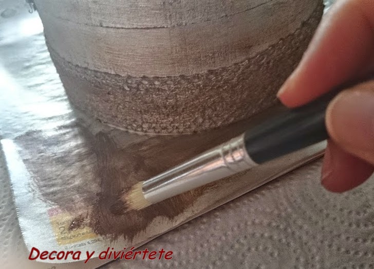 Una vez secado la pintura en spray , pinté la caja con una pintura marrón , pero la pinté como os diría .... mal pintada , me explico, como se ve en la imagen de abajo, cogía muy poca pintura y primero la pasaba por un papel y después pintaba con lo que quedaba en el pincel la caja a pinceladas largas ...... y mal puestas para que se viera el plateado del fondo.