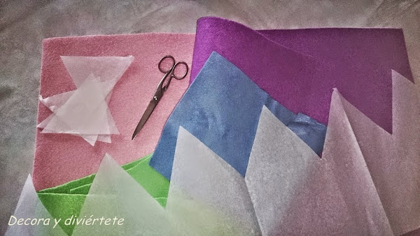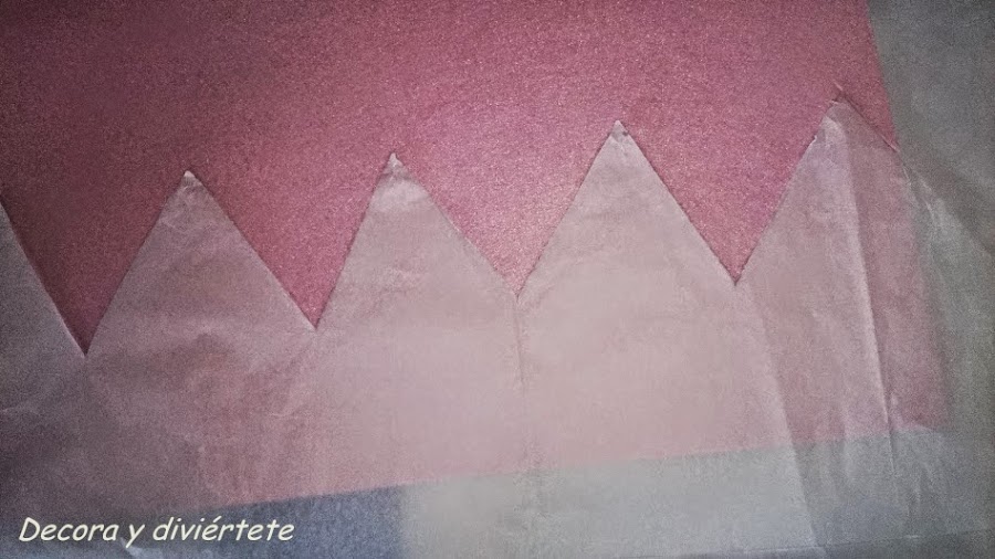 2 - Haced lo mismo con la corona mas pequeña , el fieltro de color rosa , para conseguir que quede mas estrecha , solo tenéis que bajar un poco el patrón , en la foto se ve como la parte de abajo de la tela de fieltro está mas alta que el papel de seda ...