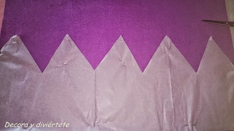 1- Poned el patrón de cartulina o papel de seda , como en este caso, encima de la pieza de la tela de fieltro que queráis mas grande , que es la base de la corona , en este caso el fieltro de color lila , fijar y reseguir con un lápiz.