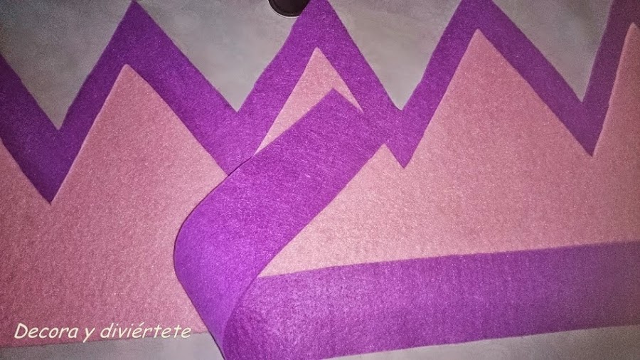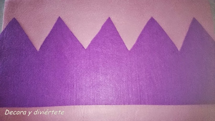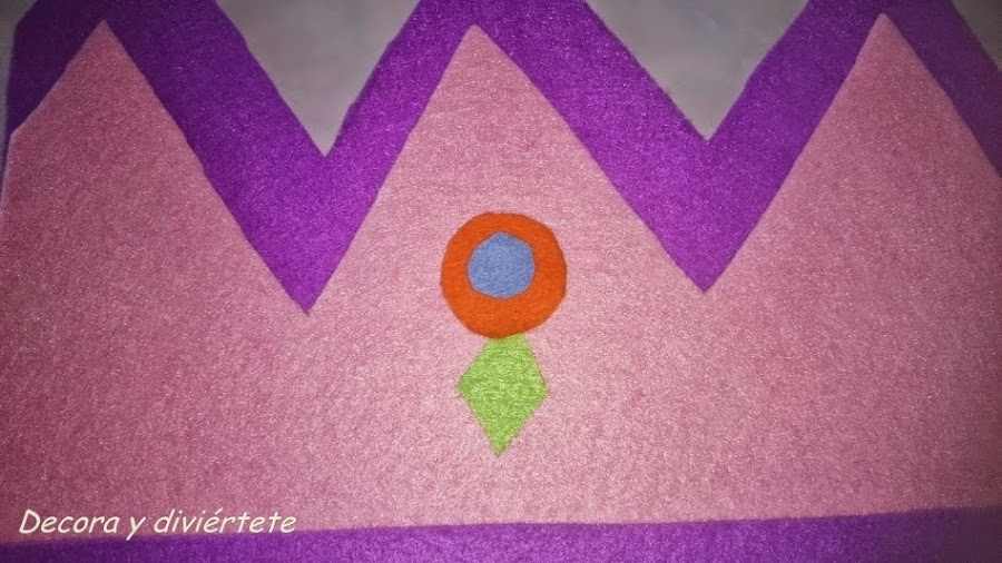 A mi me gusta mas cosida , de esta manera seguro que dura un poco mas tiempo la corona ... Si decidís coserla , lo primero es coser el belcro ( la parte rasposa ) por la parte de atrás de la corona base o sea de la corona mas grande ( lila en este caso ) . Si le ponemos belcro es para que se adapte la corona a la cabeza del niño o niña a medida que vaya creciendo ...