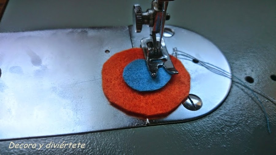 También empezaremos a coser las decoraciones , como por ejemplo si tenéis que unir alguna pieza como flores o como en este caso unir los dos círculos ... No os olvidéis de pegar belcro o poner belcro adhesivo detrás del número para ir cambiándolo a medida que el niñ@s se vaya haciendo mayor.