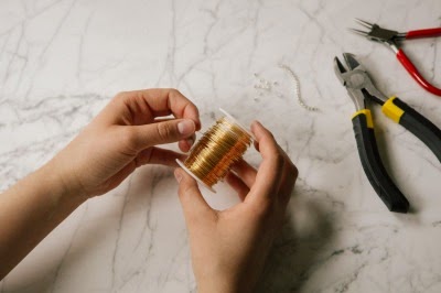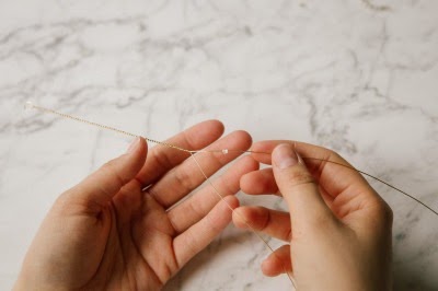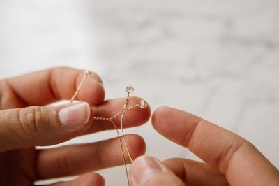 Aquí puedes utilizar perlas o piececitas más pequeñas, todo lo puedes encontrar en "los chinos" de siempre, solo tienes que separar los dos alambres ,introducir la perla y colocarla en el medio para después ir igualmente retorciendo asta llegar a la base de nuevo.