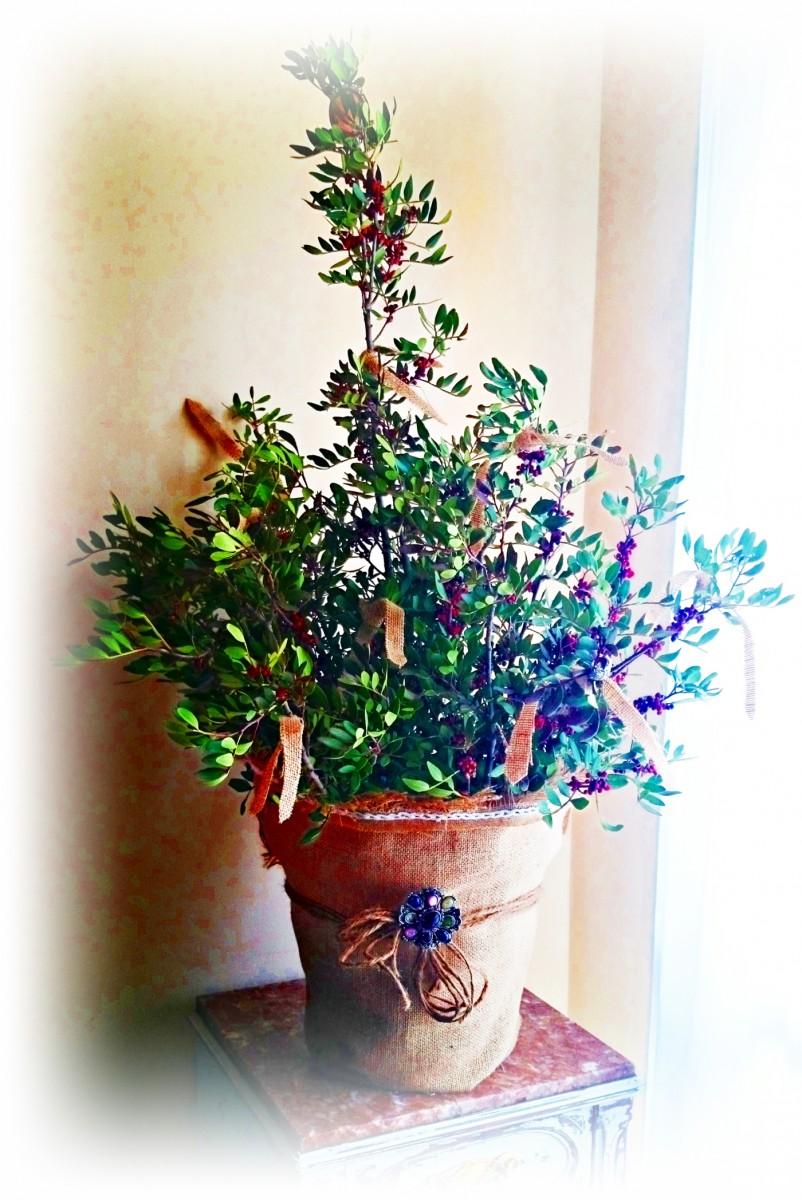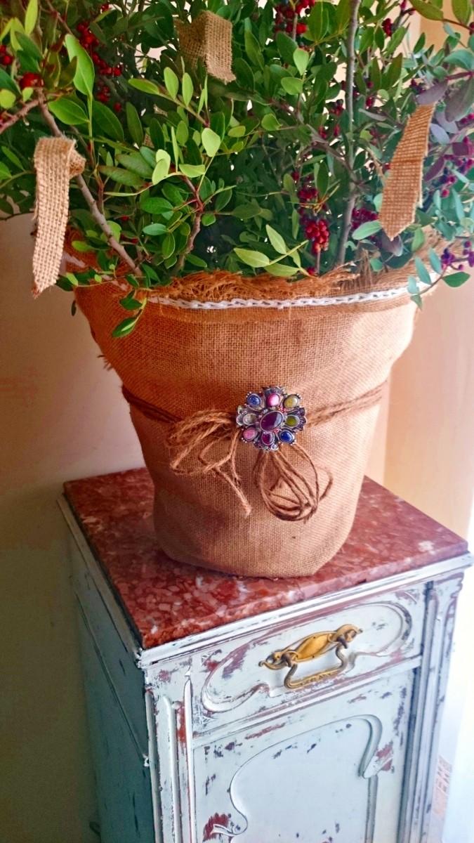 Y tampoco puede faltar el árbol de Navidad . Para el cual utilicé las ramas dispuestas de tal forma que nos recordará al tradicional abeto simplemente decorado con unos lazos hechos de arpillera.En la rama central coloqué un broche que tenía en casa y para el soporte recurrí a una maceta que forré también con arpillera rodeándola con cuerda a modo de lazo y decorada con otro broche.Hubo un tiempo en que era la niña de los broches así que tengo una colección que estaba durmiendo el sueño de los justos y me pareció una buena forma de darle uso.