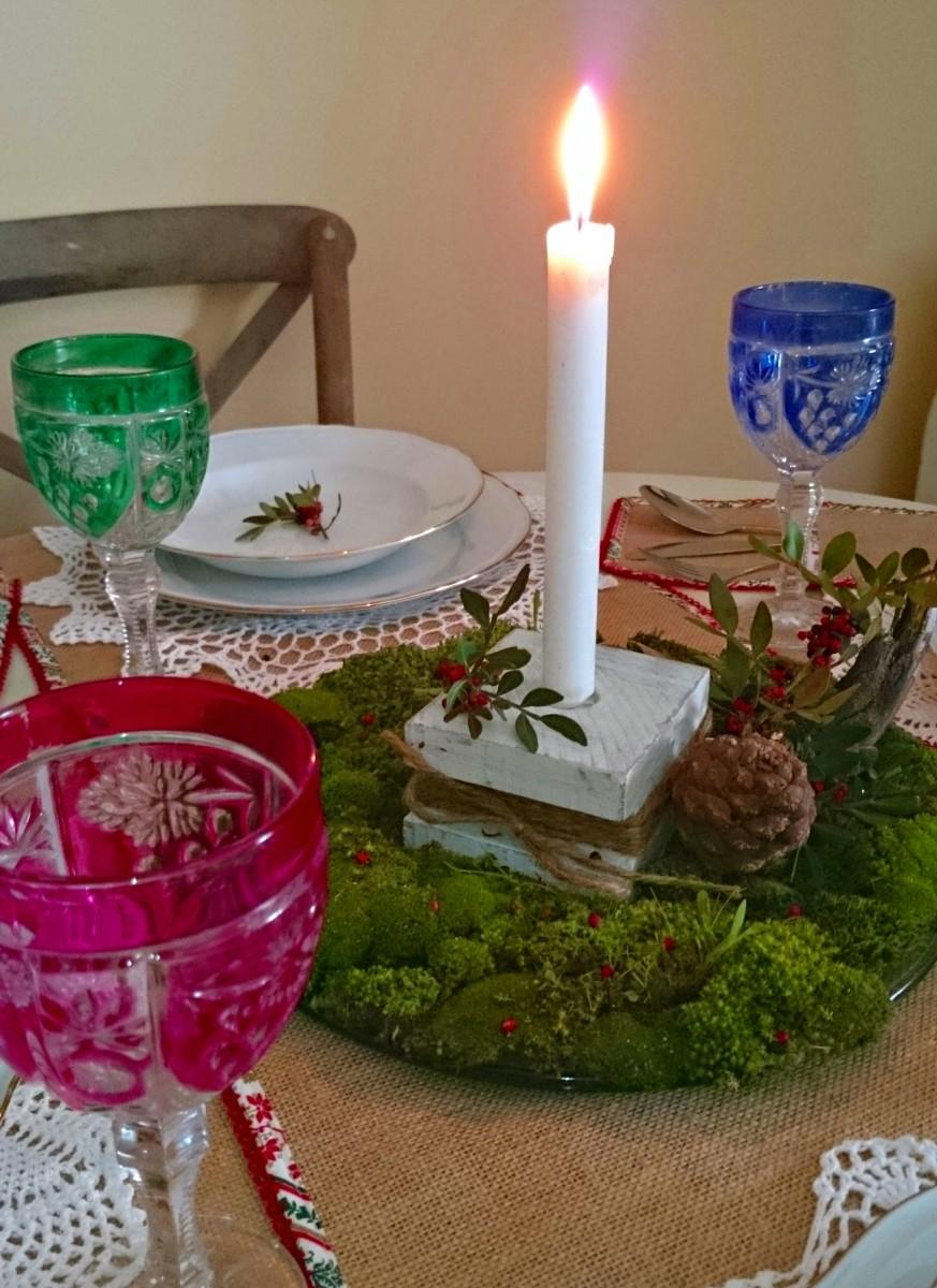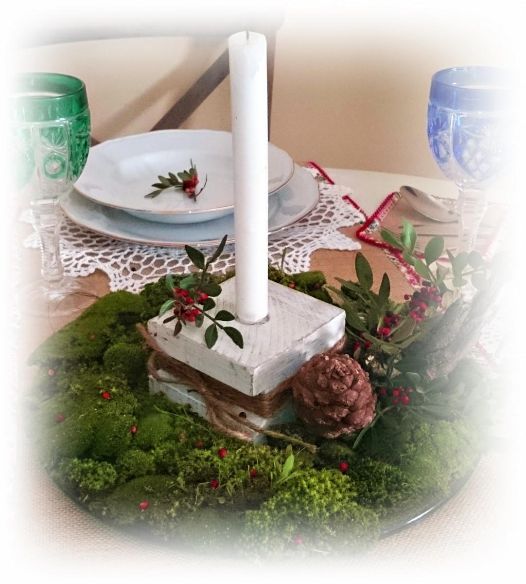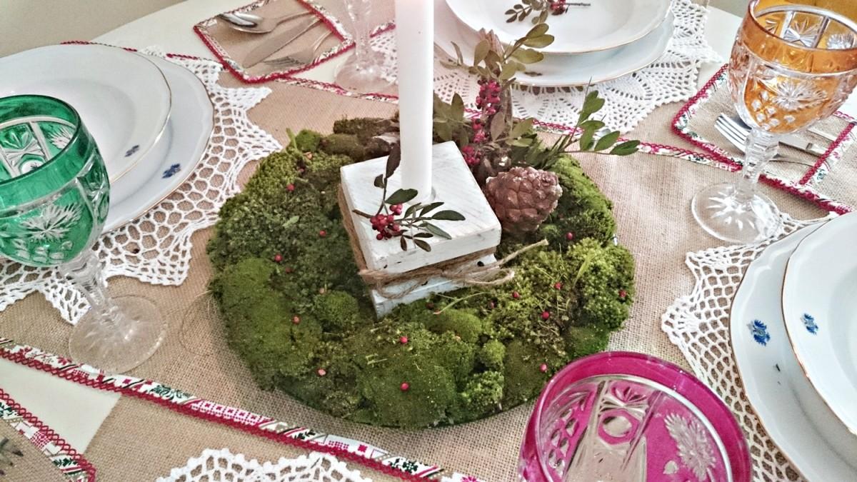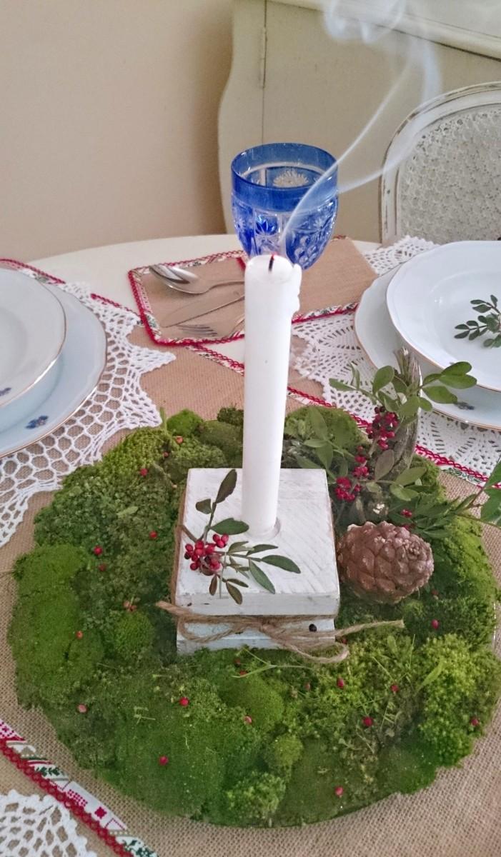 Y siguiendo con la temática natural para la mesa realicé un centro compuesto de musgo a modo de cama que completé con una piña, una rama seca y una ramita de bayas rojas para darle color y nuestro portavelas en el centro.Coloqué otras ramitas en los platos y combiné el conjunto con nuestros salvamanteles y portacubiertos navideños.