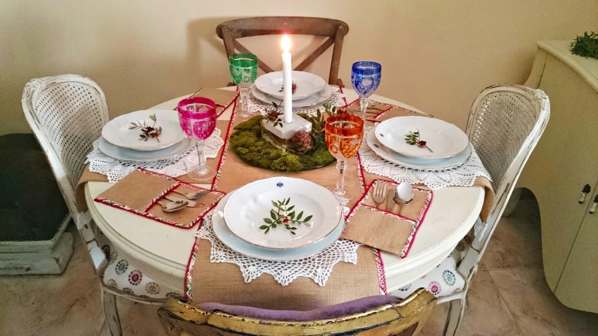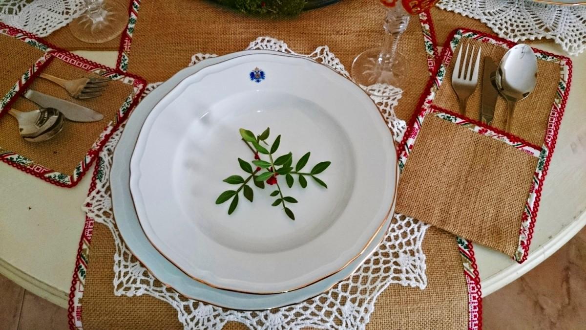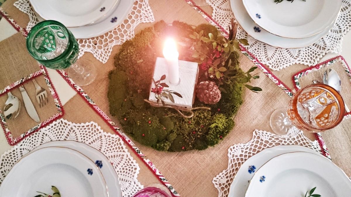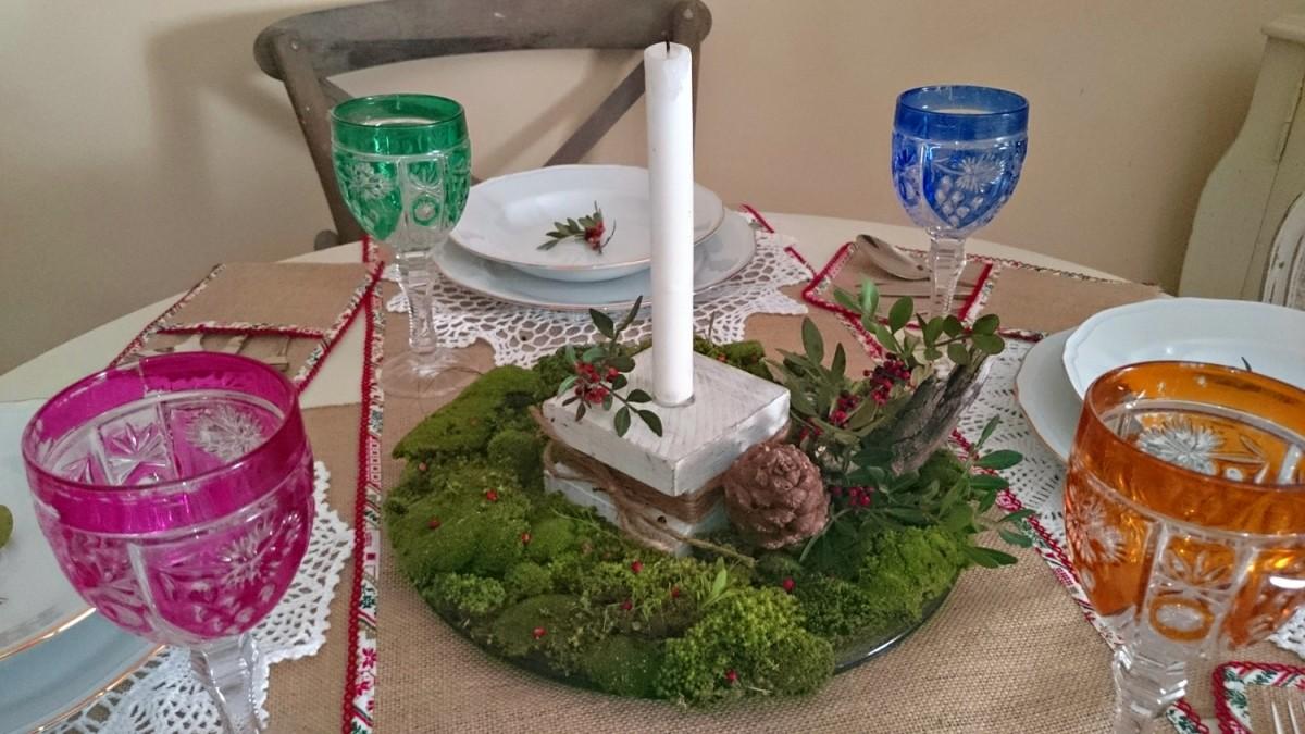 Y siguiendo con la temática natural para la mesa realicé un centro compuesto de musgo a modo de cama que completé con una piña, una rama seca y una ramita de bayas rojas para darle color y nuestro portavelas en el centro.Coloqué otras ramitas en los platos y combiné el conjunto con nuestros salvamanteles y portacubiertos navideños.