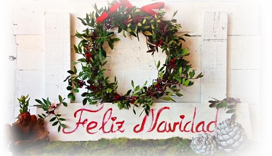 He realizado una corona navideña con alambre y las ramitas de bayas rojas a la que le he añadido un lazo rojo que tenía en casa. Un lema de Feliz Navidad que he confecionado con un trozo de palet reutilizado. He pintado las letras a mano alzada .Si tu no te atreves puedes utilizar una plantilla de estarcir, las encontrarás en tiendas de artes decorativas y manualidades