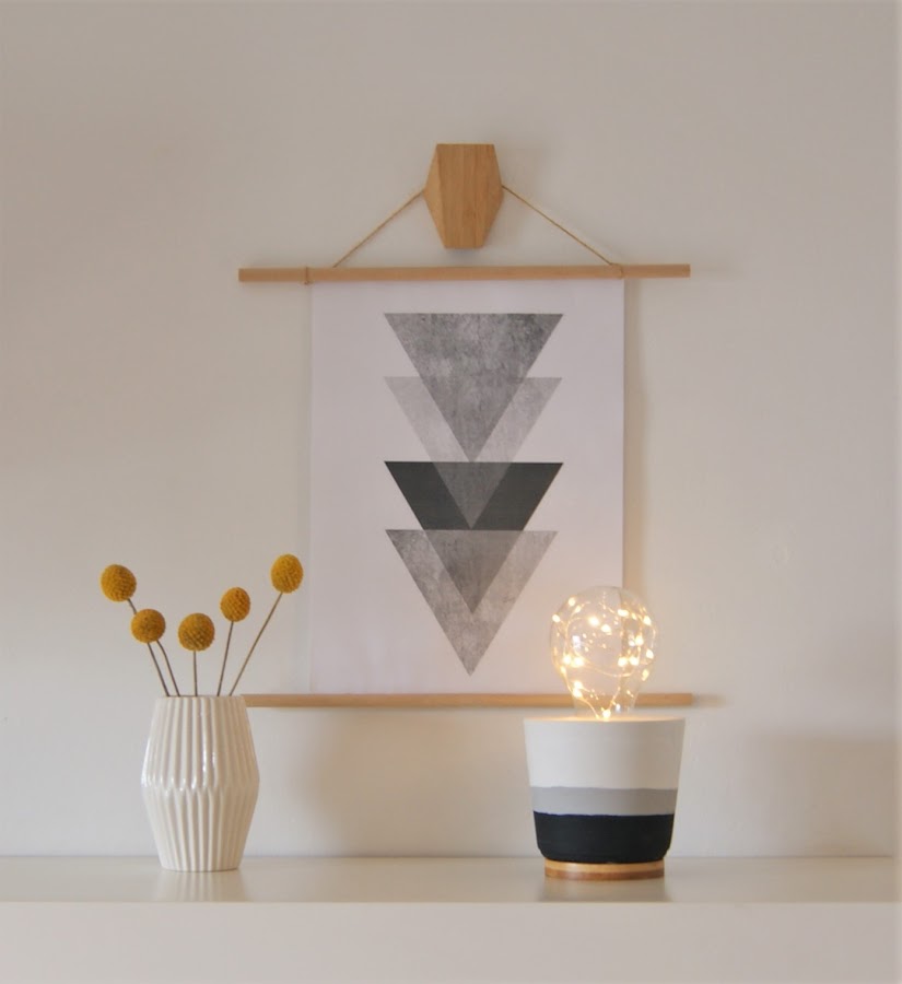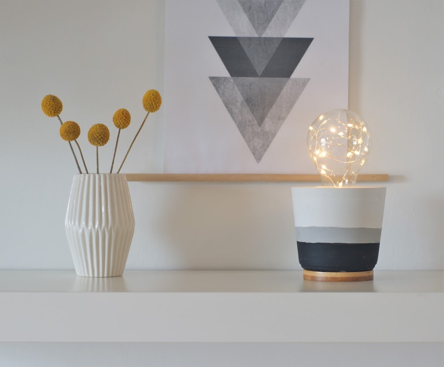 Podríamos dejar el pie en este tono blanquecino de escayola o pintarlo. ¿Opciones? ¡infinitas! Líneas, formas, pintarlo con puntos, pintarlo por completo con tonos metálicos ¡como desees! yo he optado por dejar la parte superior en blanco y realizar unas líneas en gris y negro en la parte inferior para que haga juego con la decoración de casa. Para ello me he ayudado de cinta washi tape.