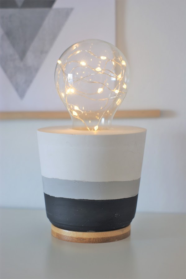 Cuando tengas el pie de la lampara listo, enciende el mecanismo de la guirnalda de luces e introdúcelo en el agujero del soporte. ¡Por arte de magia nuestra bombilla iluminará tu estancia sin necesidad de cables!