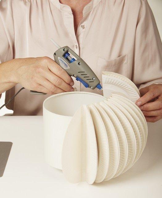 3. Eleva la pantalla de lámpara sobre una base estable (puede ser un plato sopero) y empieza a pegar los platos alrededor de ella con la pistola termoadhesiva, que habrás cargado previamente con una barra de pegamento incoloro y precalentado.