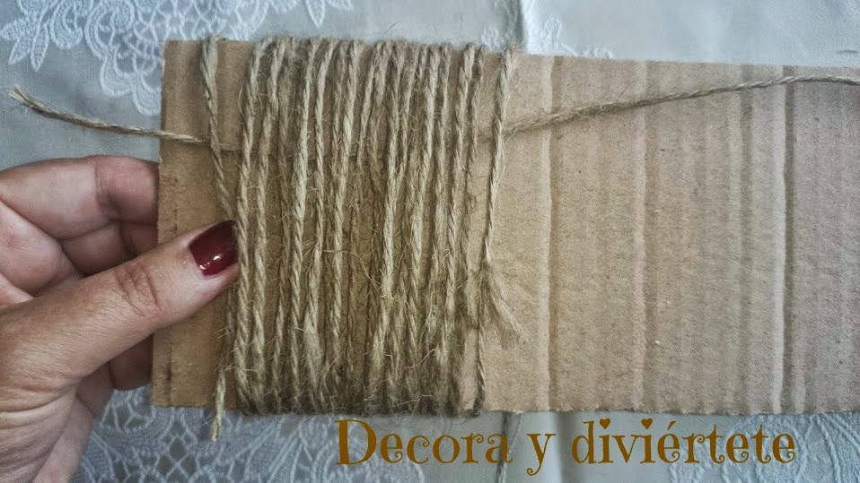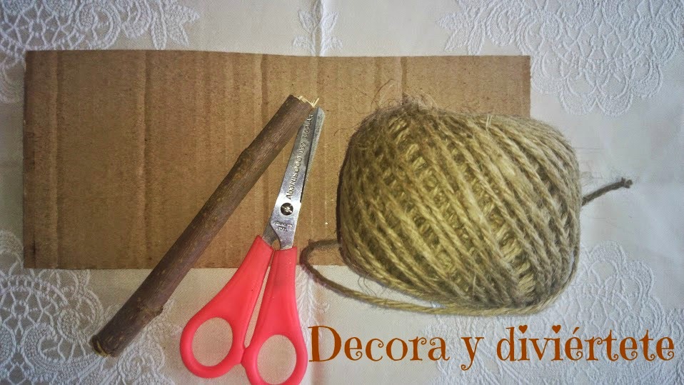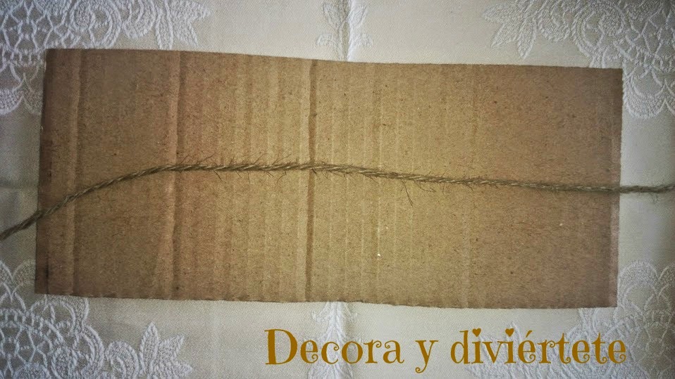 El primer paso que debéis hacer es coger el trozo de cartón con forma rectangular , cortar un trozo de cuerda , que sea mas larga que el cartón y colocar encima del mismo .